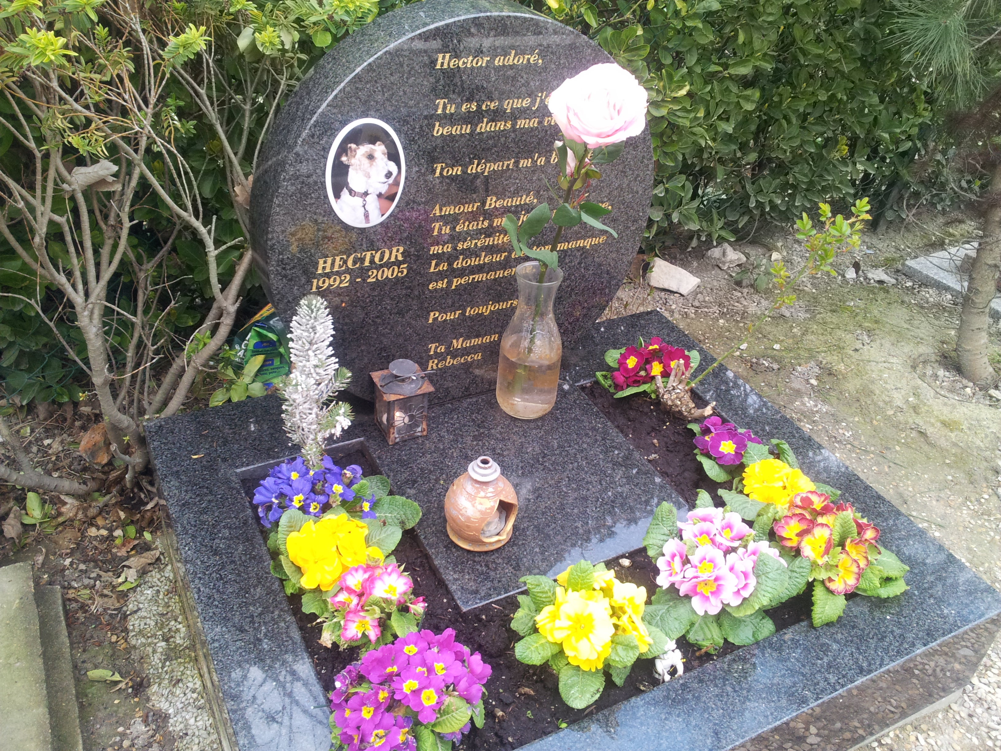 O túmulo mais impressionante, a meu ver, é o de um cachorro chamado Hector (1992-2005), que mereceu o seguinte epitáfio: “Você foi o que de mais belo aconteceu na minha vida”. Mesmo passados oito anos de sua morte, o túmulo tem velas acesas e 12 vasos de flores viçosas, que indicam visitas recentes. Outro dado curioso é a presença de gatos vivos no cemitério. Um deles, preto de olhos verdes, surpreendeu-me perto do túmulo do cão Eliot. Outro, marrom, correu por entre os ciprestes e sumiu.