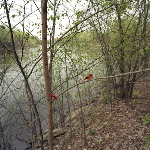 The work deals with the idea of a constructed landscape, partly natural, partly artificial. McCartney explains, “I love going on walks and hikes. When I do that I always hear birds… Birds exist for themselves not for my entertainment, you never get a good glimpse of them, they blend with the landscape or they stand too far away. So, I decided to put fake birds exactly where I wanted them. My photographs are an idealized scene.”